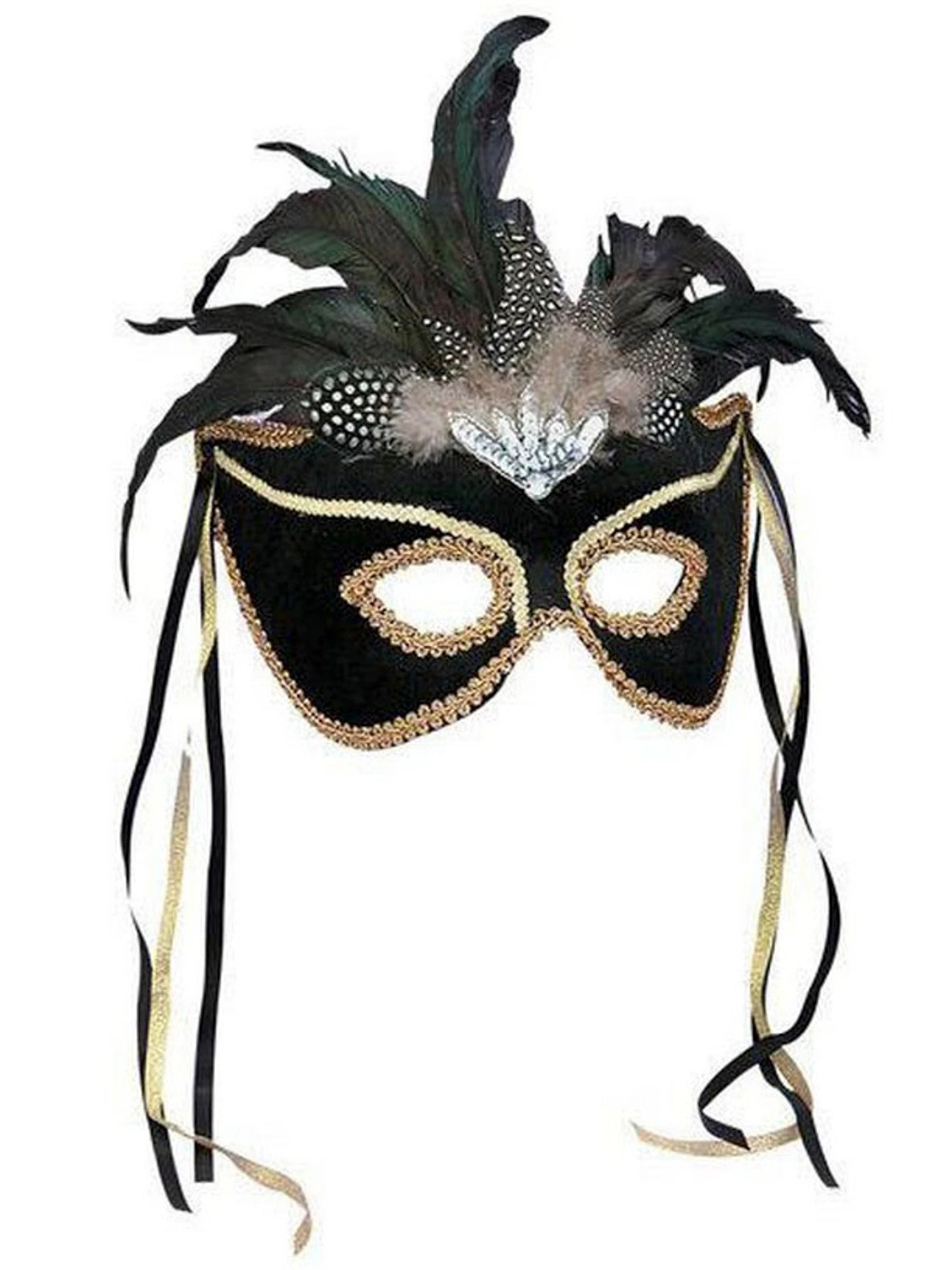 Pair this black Venetian mask with a colorful costume and it’ll really stand out at the Mardi Gras celebration or masquerade party! It’s trimmed in gold and features black and gold ribbons hanging down from either side of the mask.