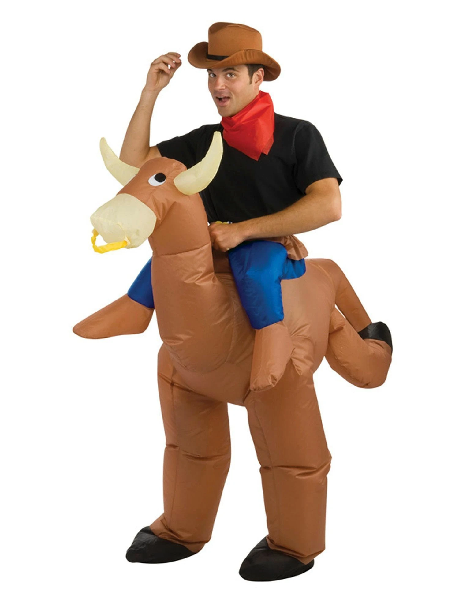 This ain’t your first rodeo. Round up the Inflatable Bull Rider Costume to wear down on the range. Riding on the back of a bull is no walk in the park. You have no room to clown around while up there as it will kick and buck trying to shake you. Get a good grip and hold on for dear life! This particular costume is made to be a humorous choice. You receive a lower body suit to wear. It is comprised of bull legs for you to wear over your own. A body surrounds your waist which has an angry bull character. Fake human legs are set above the bull so it looks like you are riding atop of it. Blow up this bad boy and the Inflatable Bull Rider costume is ready to rampage. Pick it out to wear around at Halloween parties, county fairs, and other dress up occasions.