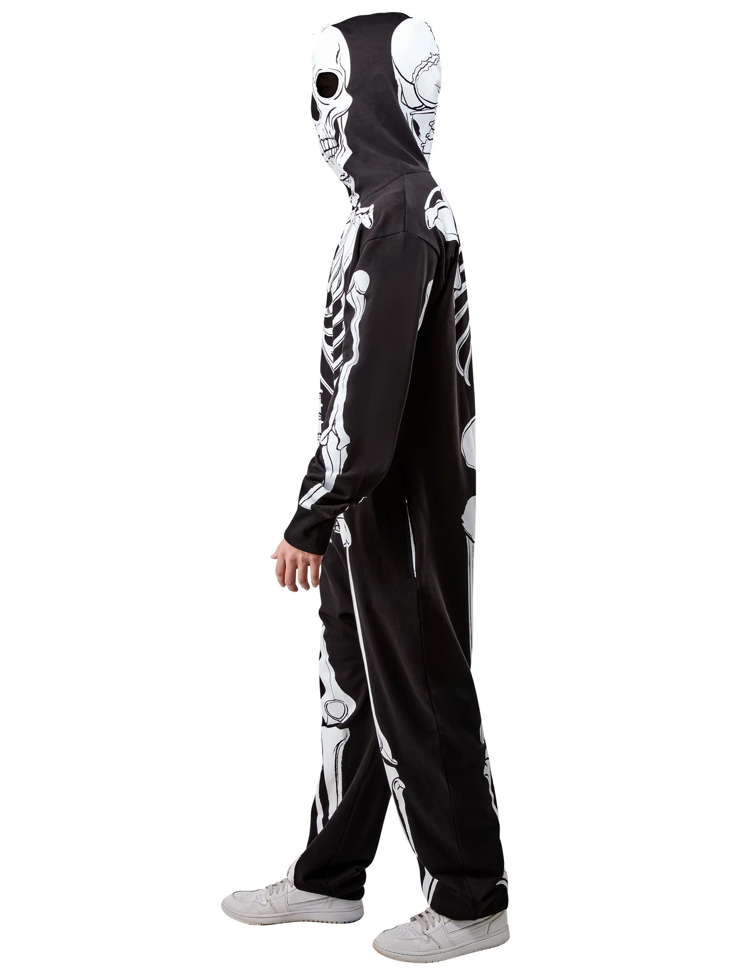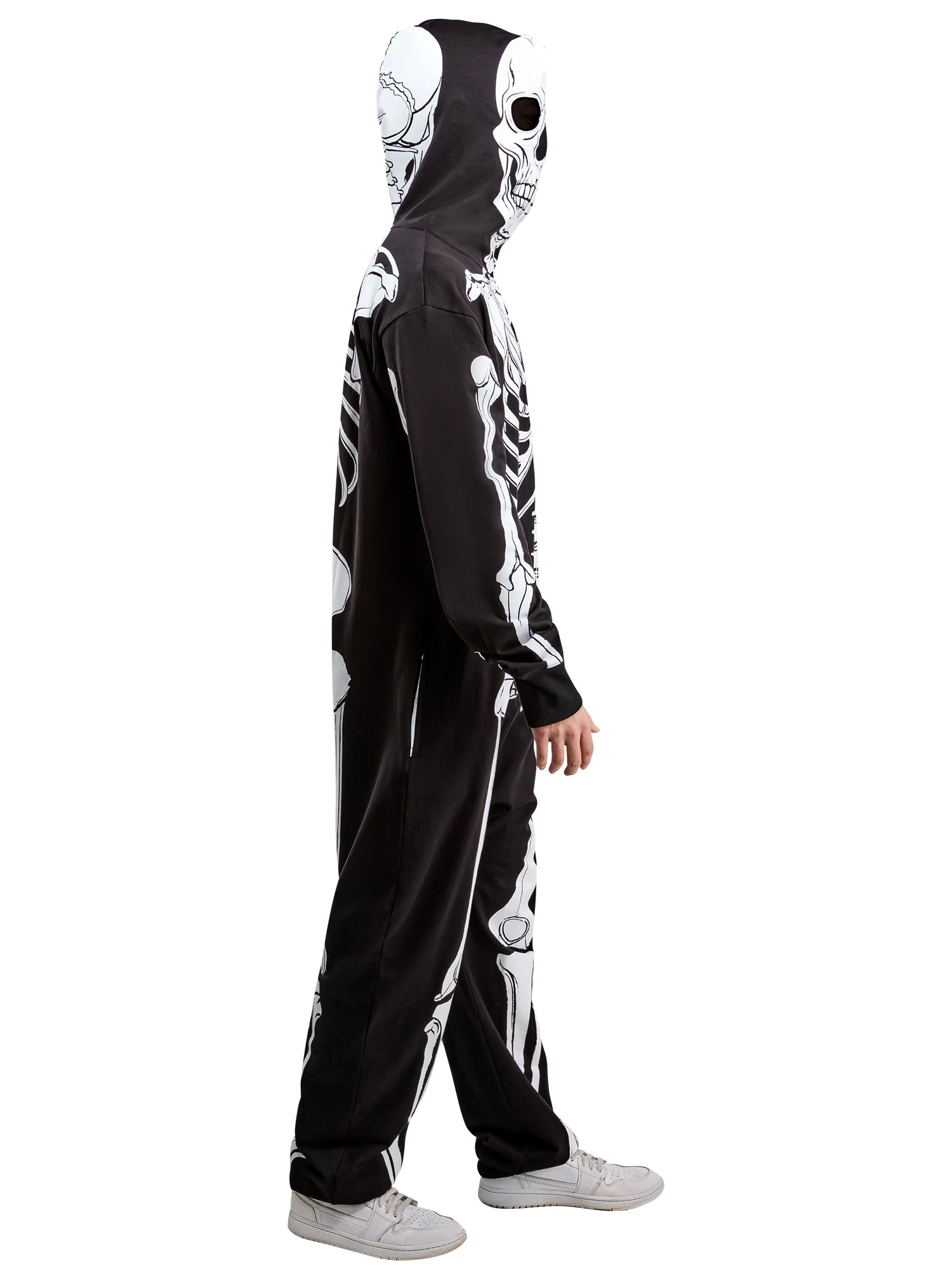 Step into effortless spooky style with the Adult Skeleton Zipsters Hooded Costume. Featuring a black skeleton design jumpsuit with a skull as a hood, this costume lets you embrace your eerie side without sacrificing warmth. The convenient front zipper that extends through the hood, creating a built-in mask with mesh eye panels for visibility and makes putting on and taking off the costume a breeze, while maintaining a secure cozy and comfortable fit throughout any event. Perfect for Halloween parties, themed events, cosplay, or simply relaxing in a fun and spooky outfit. Order now and step into your skeleton look today.