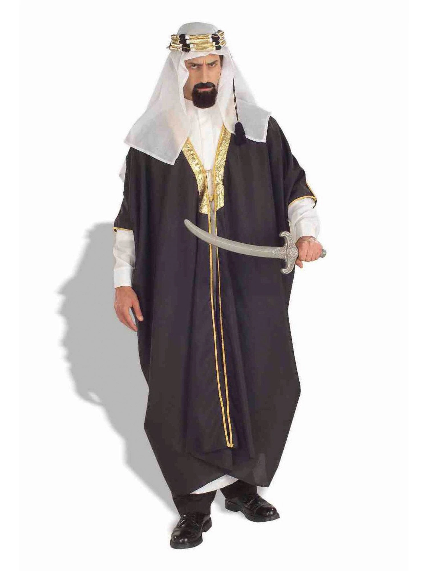 The Men’s Arab Sheik Costume consists of a three piece set. The dark brown robe featured a golden trim on the chest and down the middle, adding intricate detail. The robe is able to fit most adult male sizes. The costume also includes a headpiece with a mock gold jeweled ring and a white underrobe. All three pieces included in the costume set are made from one hundred percent polyester.