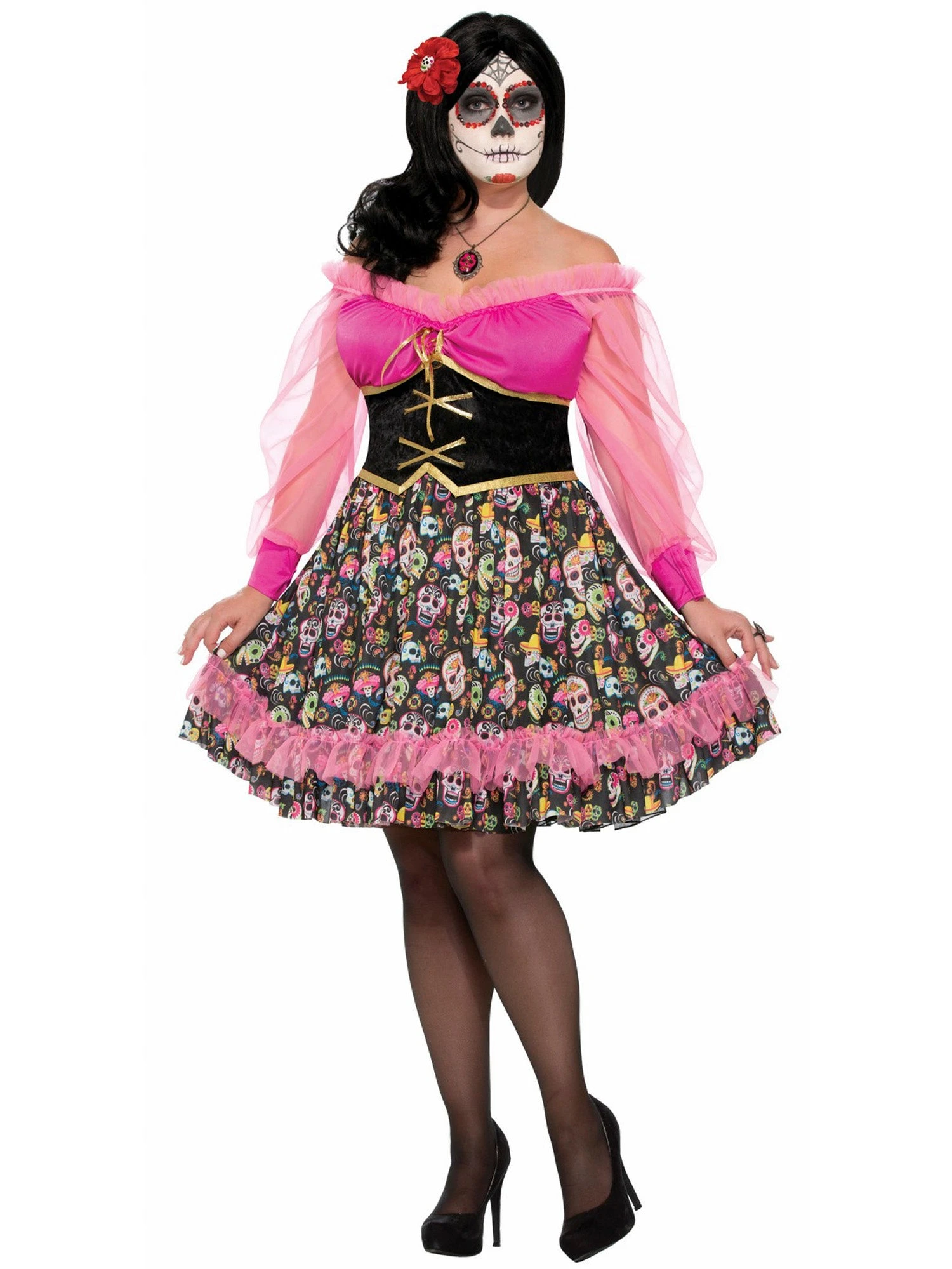 Celebrate this special celebration of the afterlife by wearing the festive Day of the Dead Senorita Womens Plus Costume. In true Dios de los Muertos fashion this product unites the macabre with the beautiful making for an unforgettable look that will be right at home at any Halloween fiesta. This product comes with a lovely pink dress with a black corset flourish and a skirt decorated with bright colorful skulls that will serve to brighten up everyones evening.