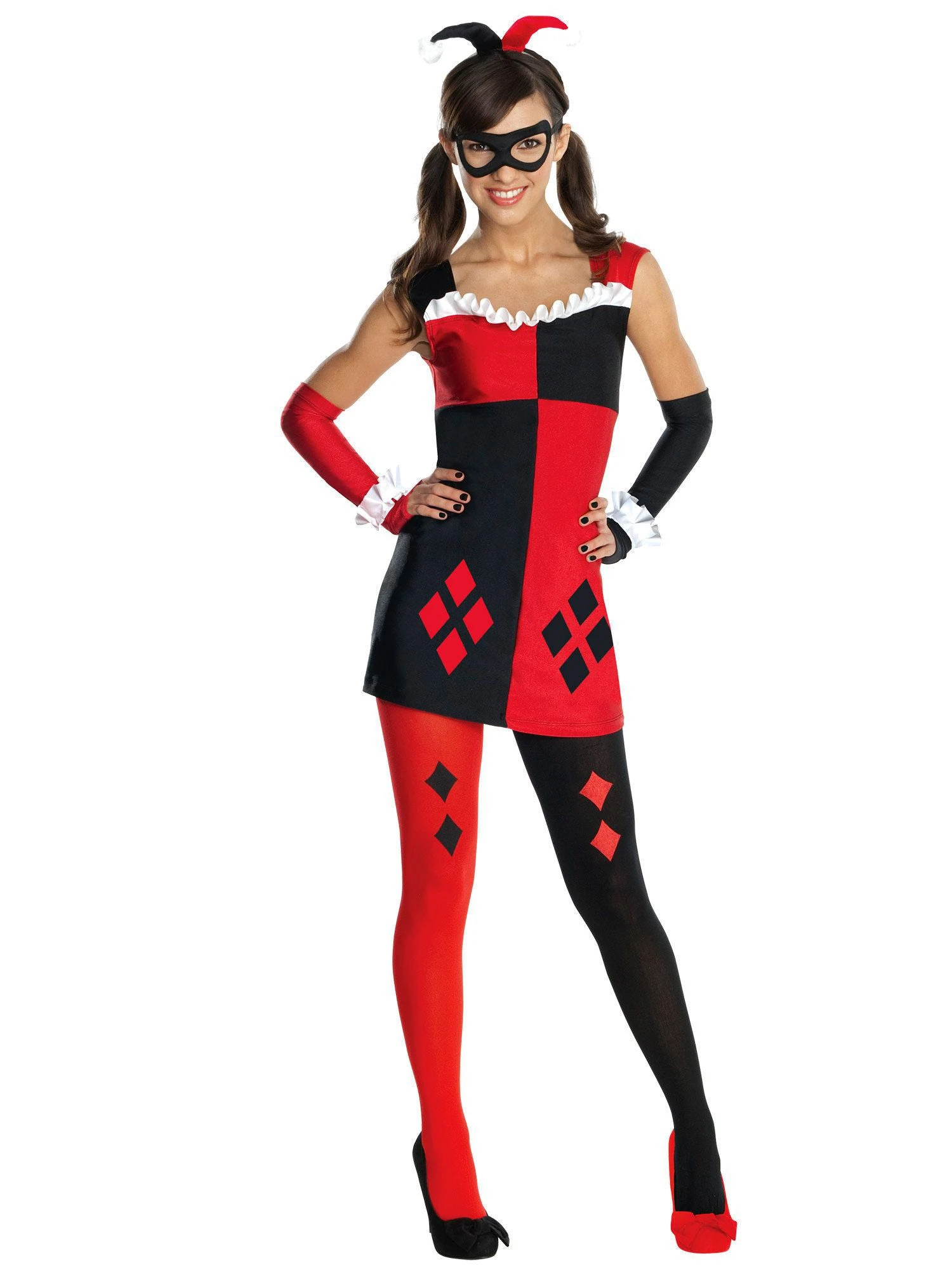 Join the Joker and bring the city of Gotham to its knees! If your daughter is lucky enough not to meet any costumed Batmans on Halloween, then there will be no one to stop any nefarious deeds she might dream up when she wears this Harley Quinn tween costume! This costume is officially licensed by DC Comics and includes everything your daughter needs to be Harley Quinn, including her black and red checkered harlequin dress, tights with one red leg and one black leg, one red glovette and one black glovette, a black eye mask, and a red and black harlequin jester head piece. Wear it with one red shoe and one black shoe, and get one of her friends to dress up as the Joker for a great group costume!