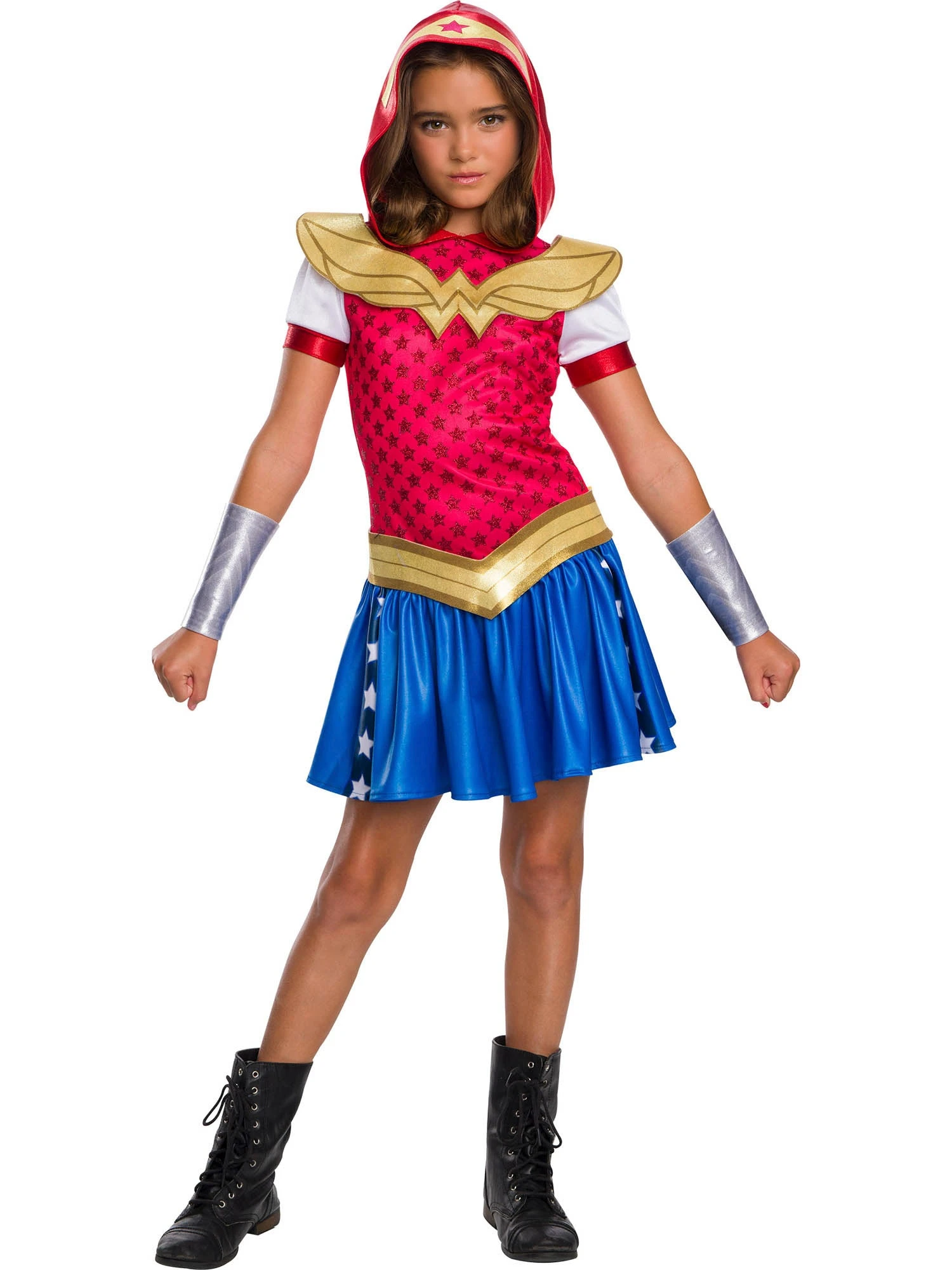 f you are planning to leave Paradise Island to attend high school or go trick or treating, then you need the Wonder Woman DC Super Hero Girls Hoodie Dress. This fashionable ensemble is officially licensed and looks just like the one Wondy wears in the Super Hero Girls series. It includes a dress with attached collar and hood, gauntlets and belt. The dress features a blue skirt with white star accents, red bodice with red star prints, short white sleeves with red trim and a red hood with gold accents on top. The attached gold collar features the ?WW? Wonder Woman logo. Silver gauntlets and a gold belt complete the set. Wonder Woman was one of the first female super heroes and she is still one of the most popular. She has been around as an adult hero for a long time, but in Superhero Girls she is a teen with typical teen problems, as well as superhero problems. Diana was born and raised on Paradise Island, an island of Amazonian warriors. But she longs to learn about the world outside h