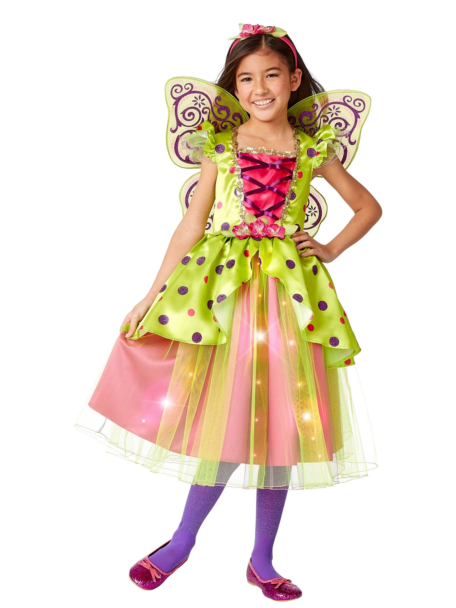 Your kid will be spreading magic wherever they go in this beautiful Kids Light Up Limelight Fairy Costume! This bright green and pink dress features lime green tulle, purple and pink polka dots, flower accents, gold trim, and a light up skirt. Also included is a pair of bright green and purple fairy wings and a matching flower headband. Even though this dress uses two button cell batteries to light up, your kid wont need anything extra to light up their smiles!