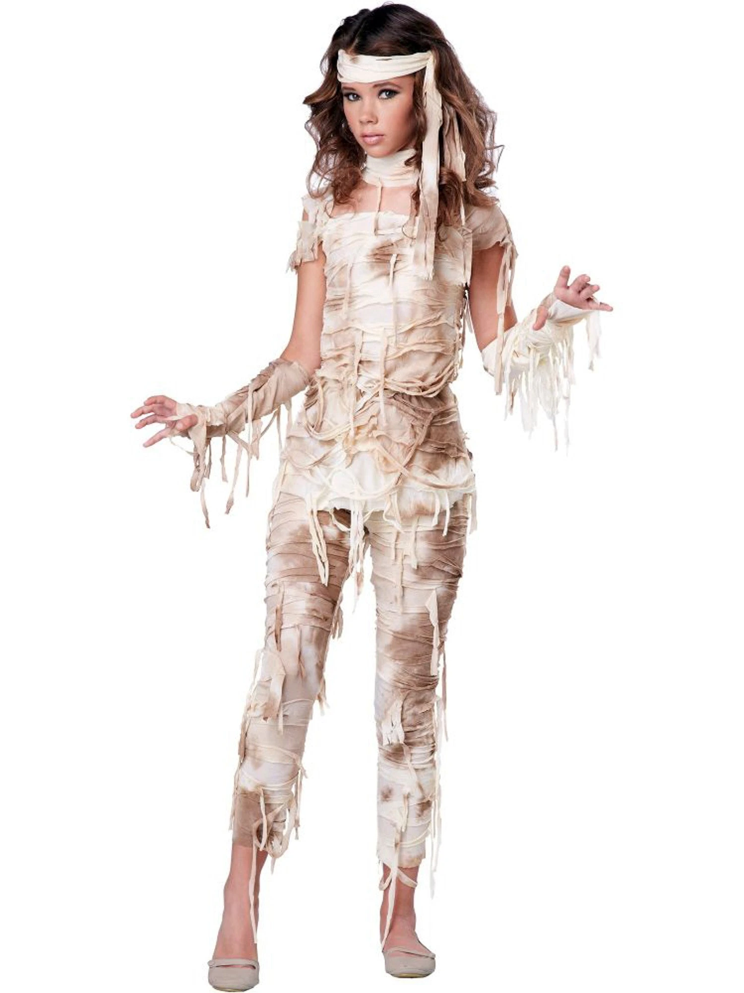 Tweens, this Halloween ask your mommy to buy you a Girl’s Mysterious Mummy Costume. Offered in Large (fits 10-12) and extra-large (fits 12-14), the ensemble includes pants, a top, neckpiece, glovelettes and head tie. All are made of white fabric that looks brown and tattered from age. Mummies are essentially dead bodies that have not naturally decayed. The most common method of mummification is quick drying the body – using the sun, fire/smoke and chemicals- since bacteria and fungus cannot live without water. Many famous mummies were created purely by accidents, but Egyptian mummies were created purposefully. Ancient Egyptians believed the life force left the body at death, but it could be lured back and then the body and life force would enter the nether world. It is perhaps this belief that lead to stories of reanimate mummies that stalk the living. Who will you haunt this Halloween?