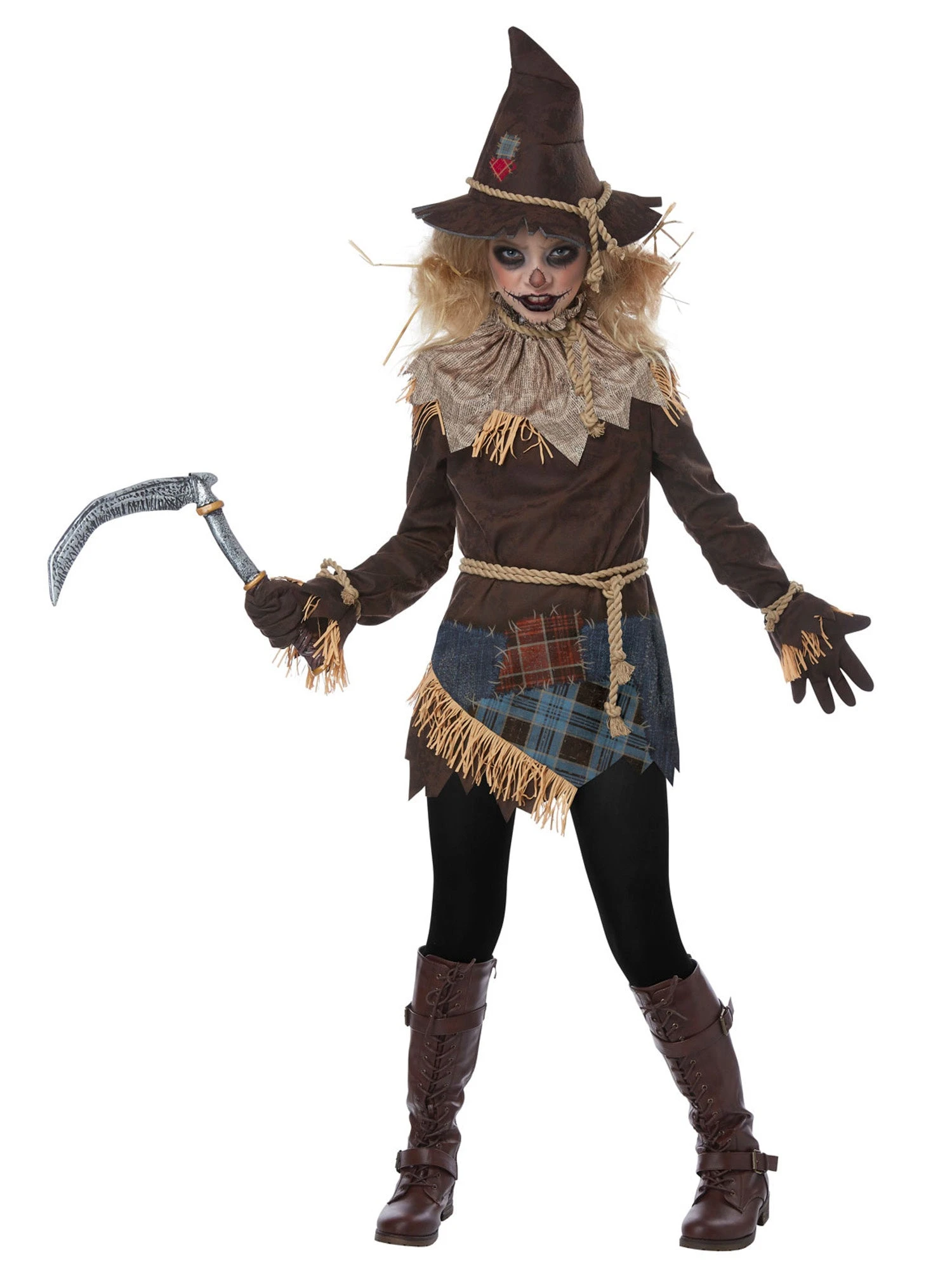 Create an adorable scarecrow or go for some scares in this Creepy Scarecrow Child Costume. Costume includes tunic top, hat, collar, rope belt and scythe. Does not include gloves, tights or boots.
