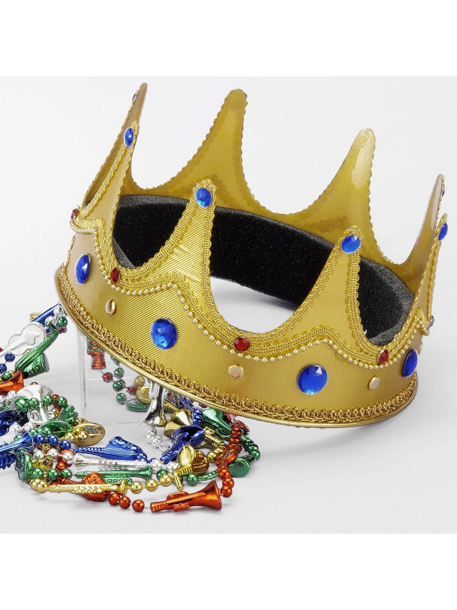 Faux jewels adorn this gold, fabric crown which snaps closed in the back. Crown is one size fits most adults. Beads not included.