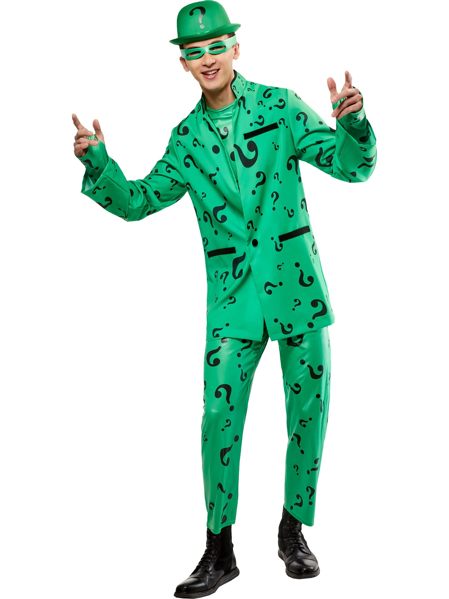 With this set, you will receive everything you need to become this mysterious DC Comics Batman and Robin foe. Featuring the Riddler’s classic green jumpsuit covered in black question marks, along with a matching coat, hat, and eye mask, you’ll be ready to terrorize Gotham with your philosophical torture traps and riddles this year while sporting this killer wear. Pick up your costume today, and then form alliances with the Joker, Harley Quinn, Poison Ivy and the rest of the DC Comics villains to take down Batman once and for all.
