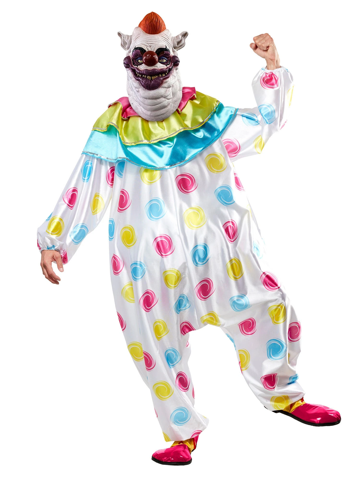 Whether you’re wrapping your victims up in cotton candy cocoons or eating them whole via shadow puppets, you’re going to have the time of your life sporting our Men’s Killer Klowns from Outer Space Fatso Costume this year. With this set, you will receive an oversized white clown jumpsuit with colorful accents, a pink, green, and blue layered collar, and a spooky Fatso mask. Get yours today and go scare all your friends with ease!