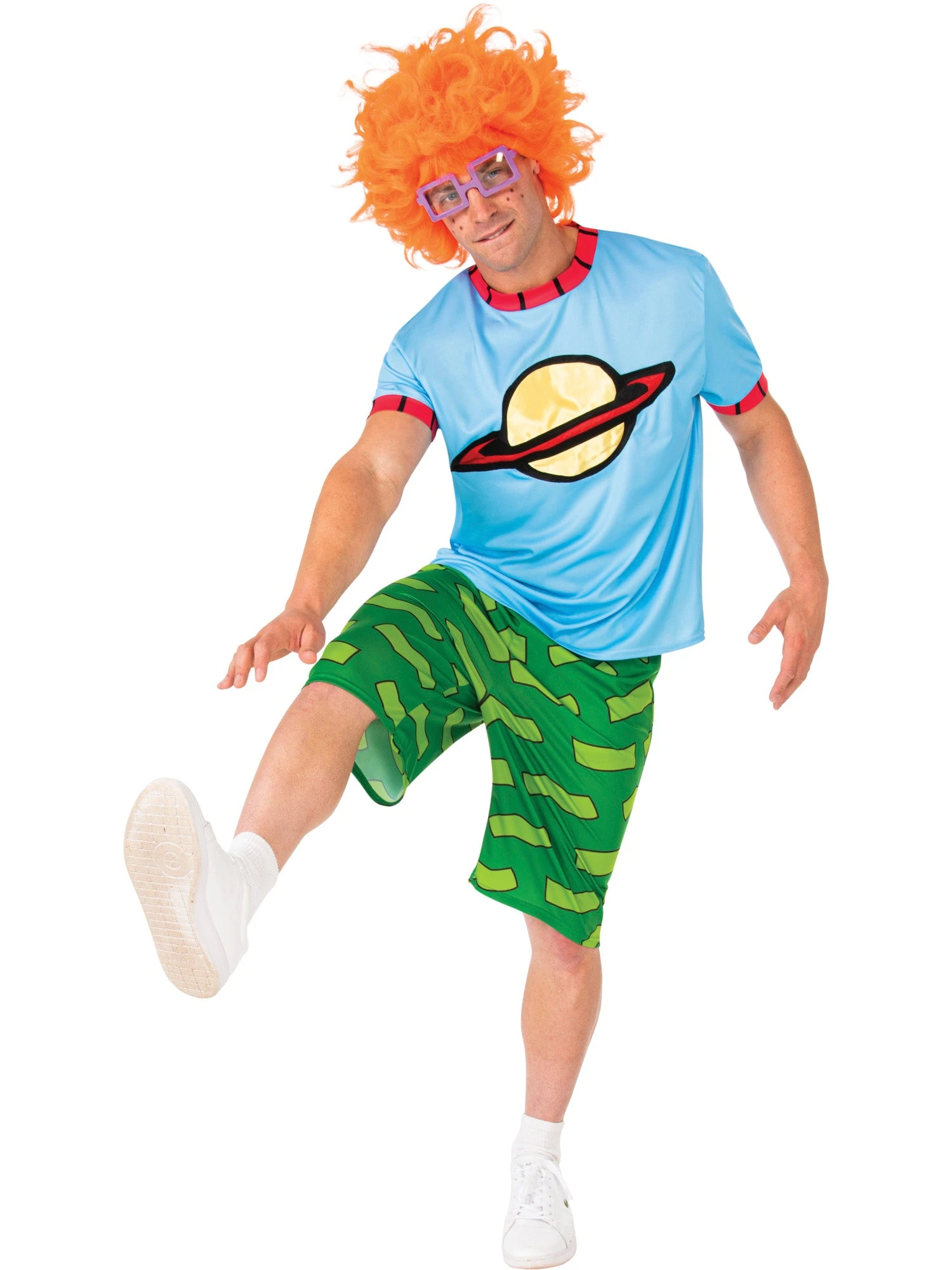 Head to the party wearing the Men’s Rugrats Chuckie Finster Costume – Deluxe and you’ll be telling everyone about your awesome tales with Tommy, Phil, and Lil. With this set, you will receive everything you need to become everyone’s favorite fearful red-headed baby on the show. Featuring a blue printed top with a planet on the front, a pair of green shorts, and a red wig, and glasses, you’re going to love this iconic Rugrats look this year.