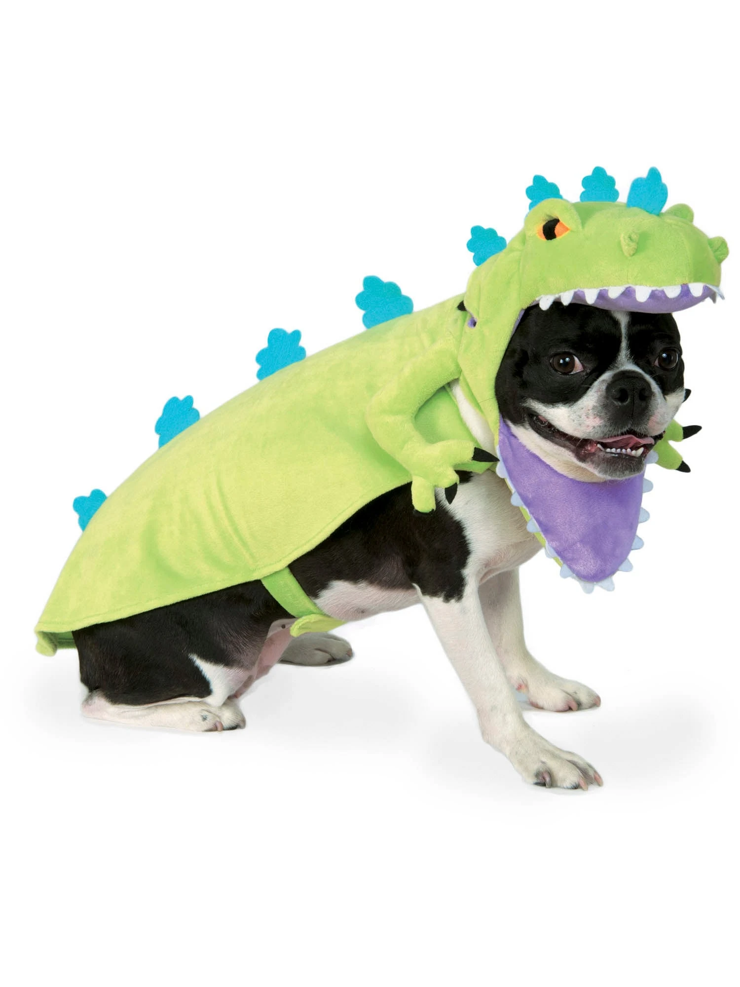 Embrace your 90’s Nostalgia with a Rugrats themed pet costume. Buy the Rugrats Reptar Pet Costume and transform your cat or dog into the famous green and blue Tyrannosaurus rex. Featuring a green Reptar hoodie with blue spikes on the back and attached belly straps, a purple open mouth headpiece with teeth, and yellow eyes, you are going to love this precious Rugrats look on your pet this year. For fun, dress up as Tommy Pickles or another Rugrats character to have a Rugrats Halloween!