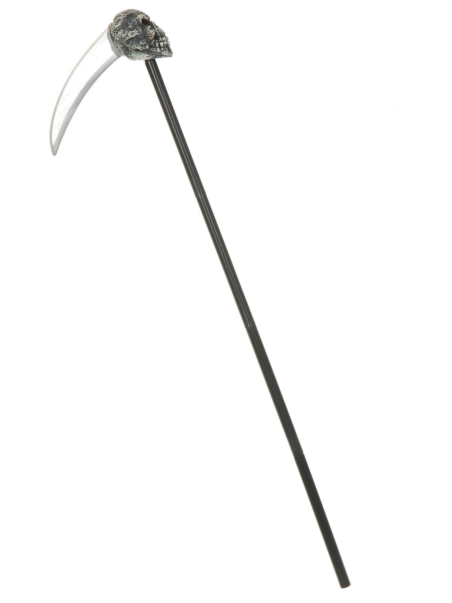 This Skull Sickle is a great prop weapon to add to a Halloween ensemble with a horror theme. The black staff is adorned with a skull shaped handle and a curving blade and can be matched to costumes sold here such as The Grim Reaper or other skeleton characters.