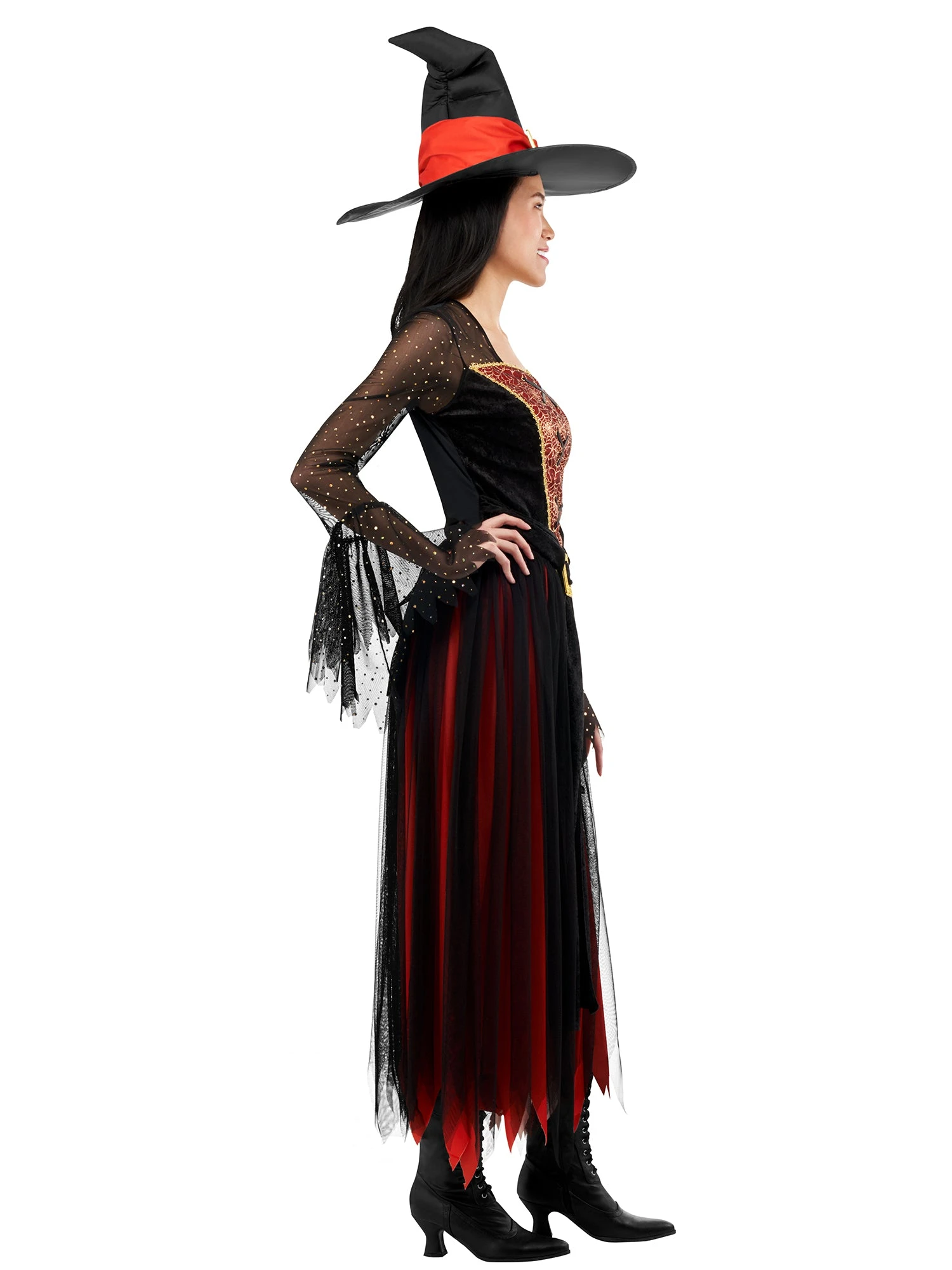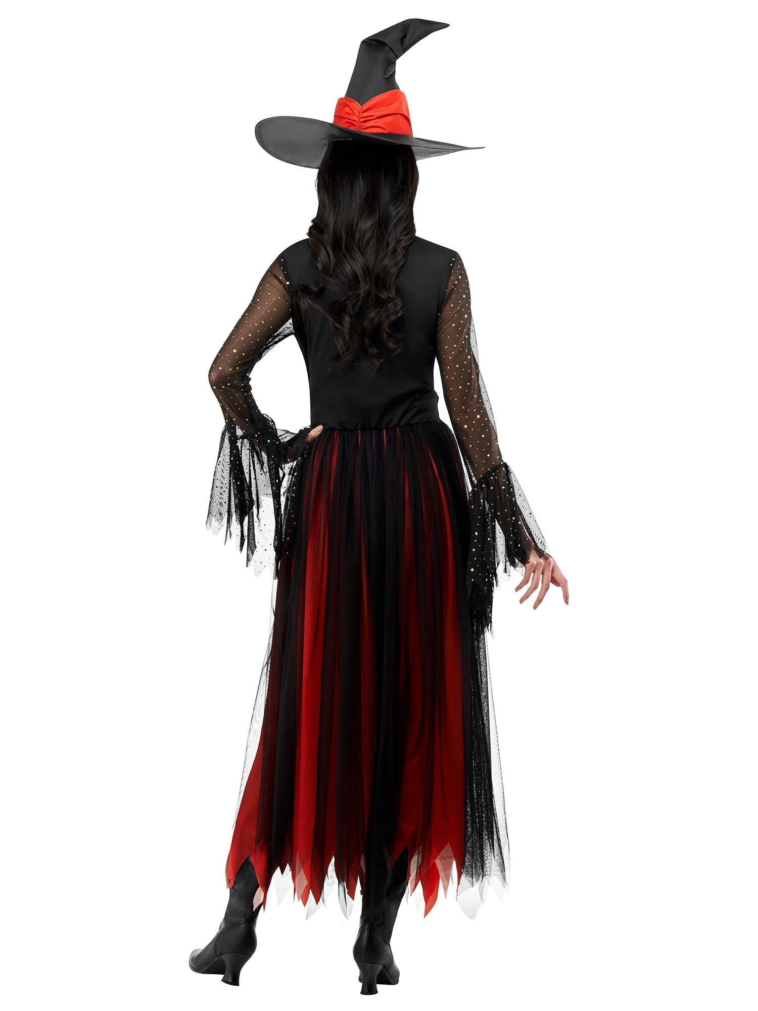 Unleash your inner enchantress with our Women’s Black and Orange Enchanted Witch Costume. As you enter the party, you’ll cast spells, brew potions, and captivate everyone with your dark and elegant presence. This set features a gorgeous black and orange spiderweb-themed dress, exuding an air of mystique. To complete the enchanting transformation, a matching pointed black witch hat with orange accents is included. Don’t miss out on the opportunity to embrace the allure of witchcraft and mesmerize the crowd with this enchanting attire.
