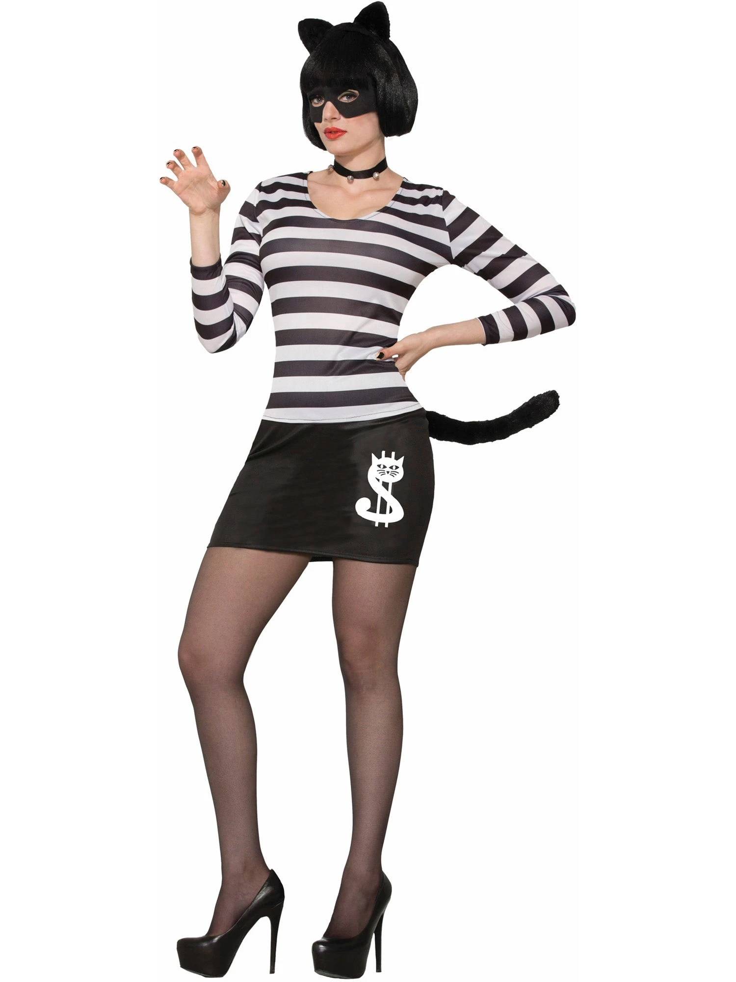 Experience feline sophistication with our Women’s Cat Burglar Costume. This costume includes a headband with ears, an eye mask, a black and white striped shirt, and a skirt with an attached tail. Perfect for Halloween or themed parties, embrace your inner cat burglar and steal the show.