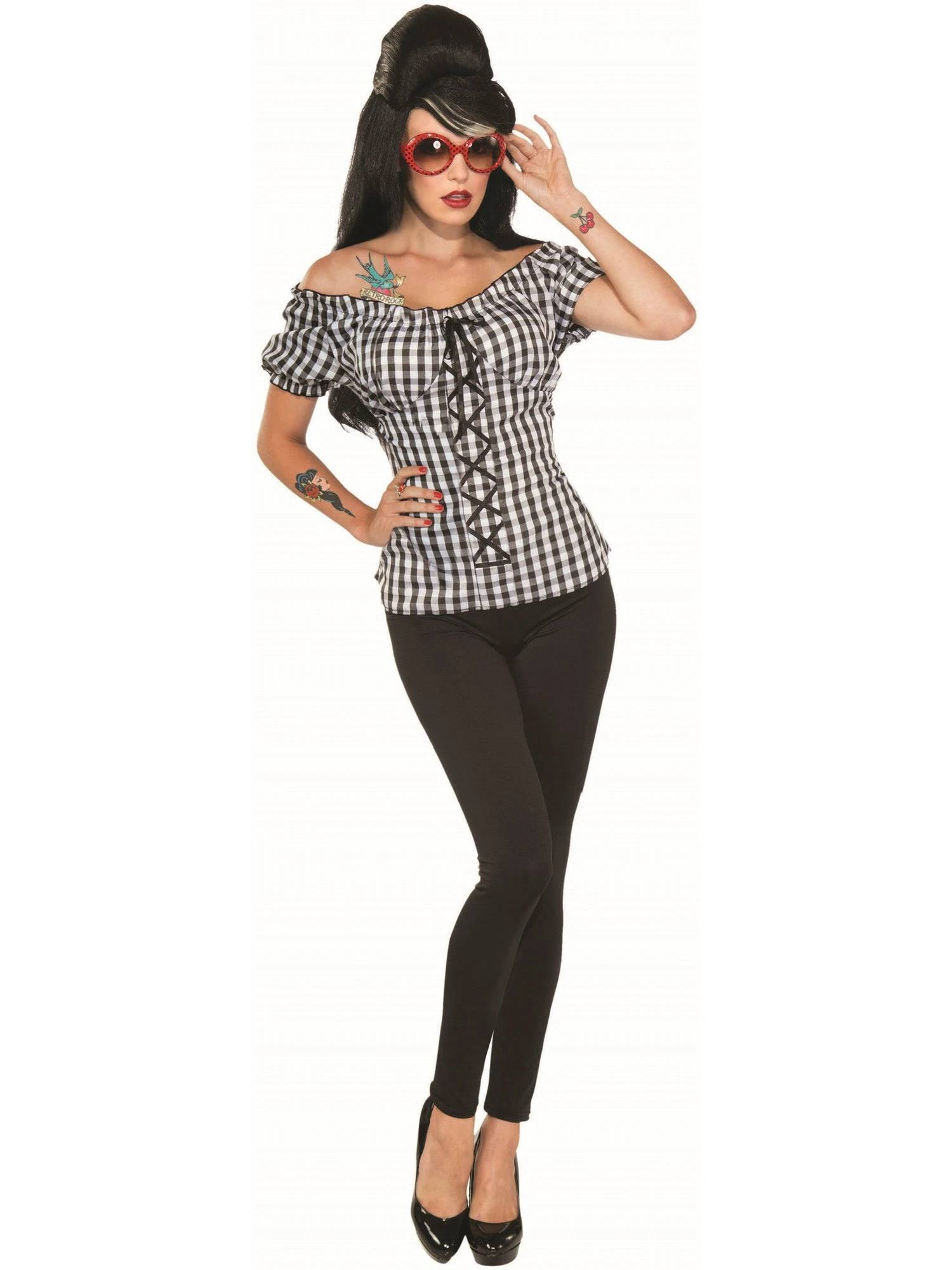 This Women’s Retro Rock Babe Costume captures the essence of 80’s rockabilly style with its black and white plaid shirt adorned with lace detailing and sleek black leggings. Get ready to rock the party and unleash your inner rebel with this bold and edgy costume!