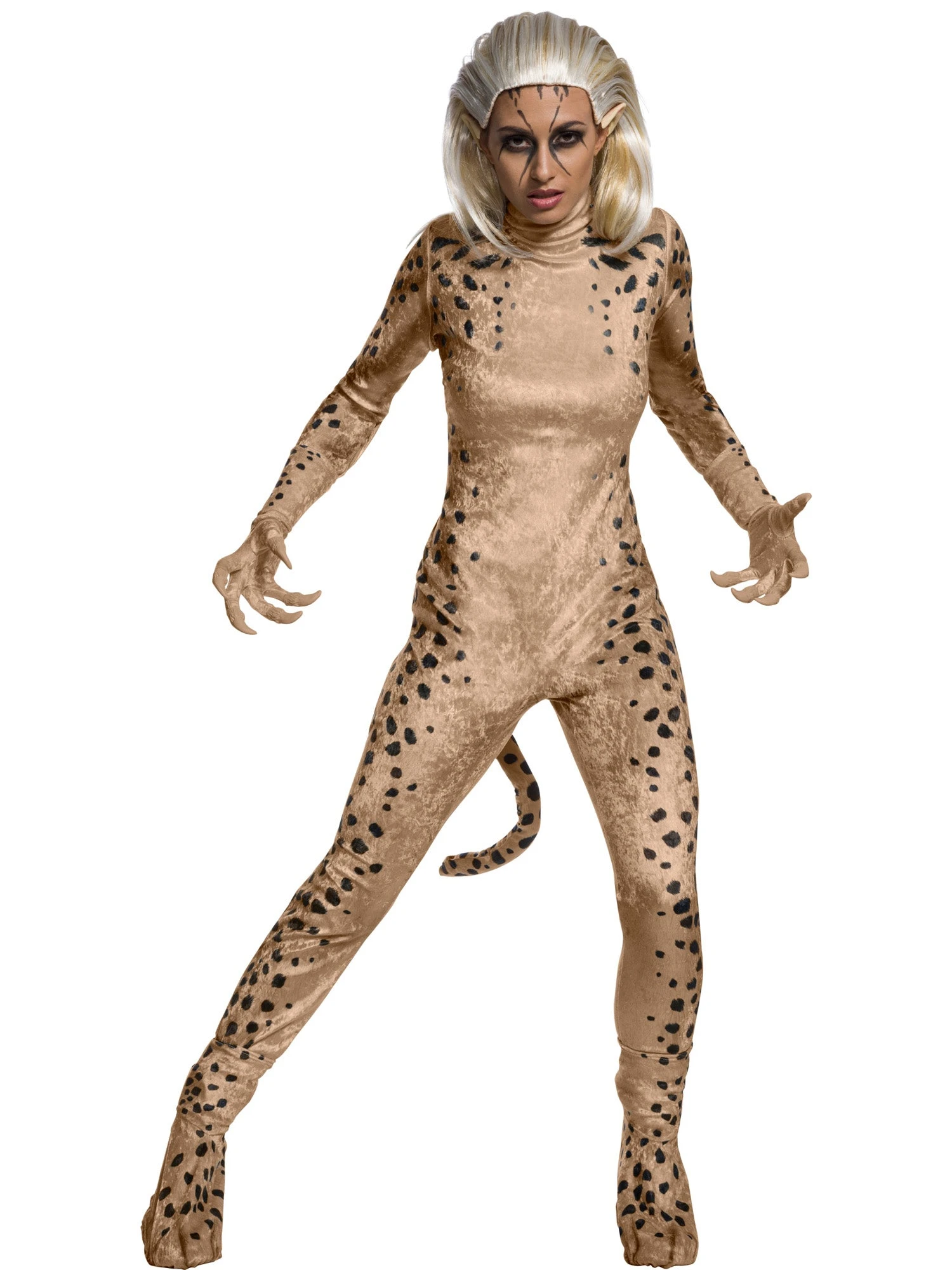 Unleash your wild side with the Women’s Wonder Woman 1984 Cheetah Costume – Deluxe, the ultimate look for fans of DC Comics’ fiercest feline villain! Inspired by Barbara Minerva’s transformation in Wonder Woman 1984, this officially licensed costume features a sleek, form-fitting cheetah-print jumpsuit with an attached tail for a fierce, dynamic silhouette. Coordinating shoe covers blend seamlessly with the suit, while the included gloves feature attached claws to complete your untamed transformation. Top it off with matching cheetah ears for a head-to-toe look that’s as bold and powerful as the character herself. Perfect for Halloween, cosplay, or themed events, this deluxe Cheetah costume brings villainous style and primal power to center stage. Order now and let your inner predator prowl!