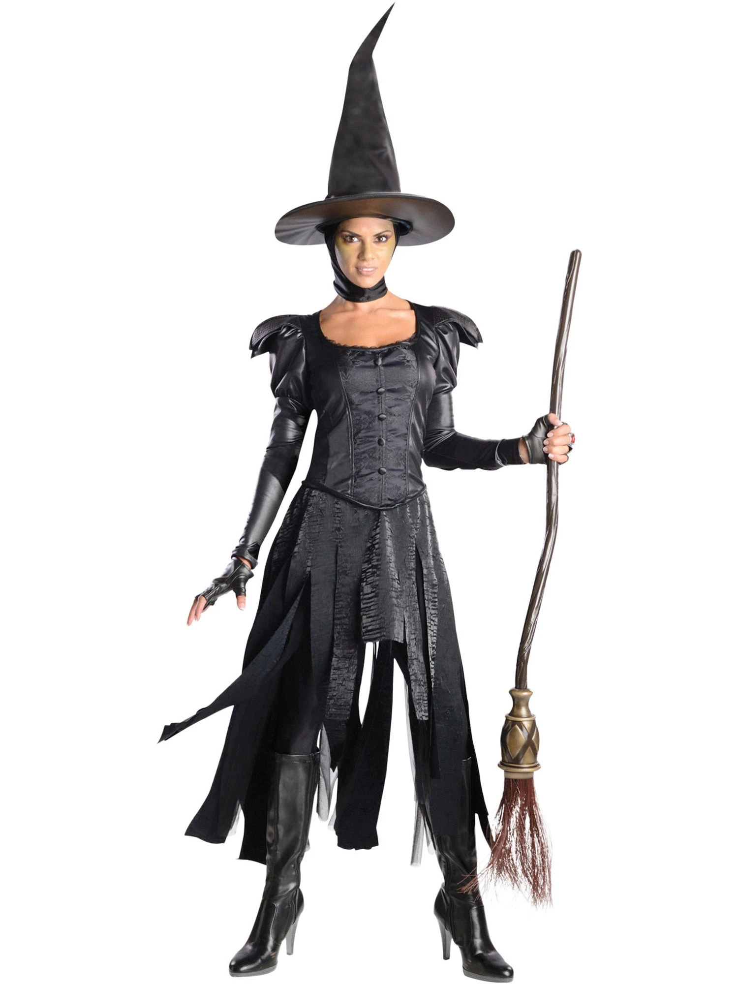 Your legend lives on and now you can be the scariest witch on Halloween when wearing the Womens Deluxe Wicked Witch of the West Costume. This costume comes with a black dress that is both contemporary and classic. The order features faux leather sleeves with pointed shoulders, buttons down the front of the top, and tattered strips that make up the skirt. The final piece of the costume is an attached choker and hat combo that makes your face the center of attention. The hat is pointed at the top and hooked in order to give you a sinister look. This costume will certainly make you one of the most impressive partygoers around this year, but visit the accessories page and find some green makeup to wear on your face for a more horrifying look this Halloween.