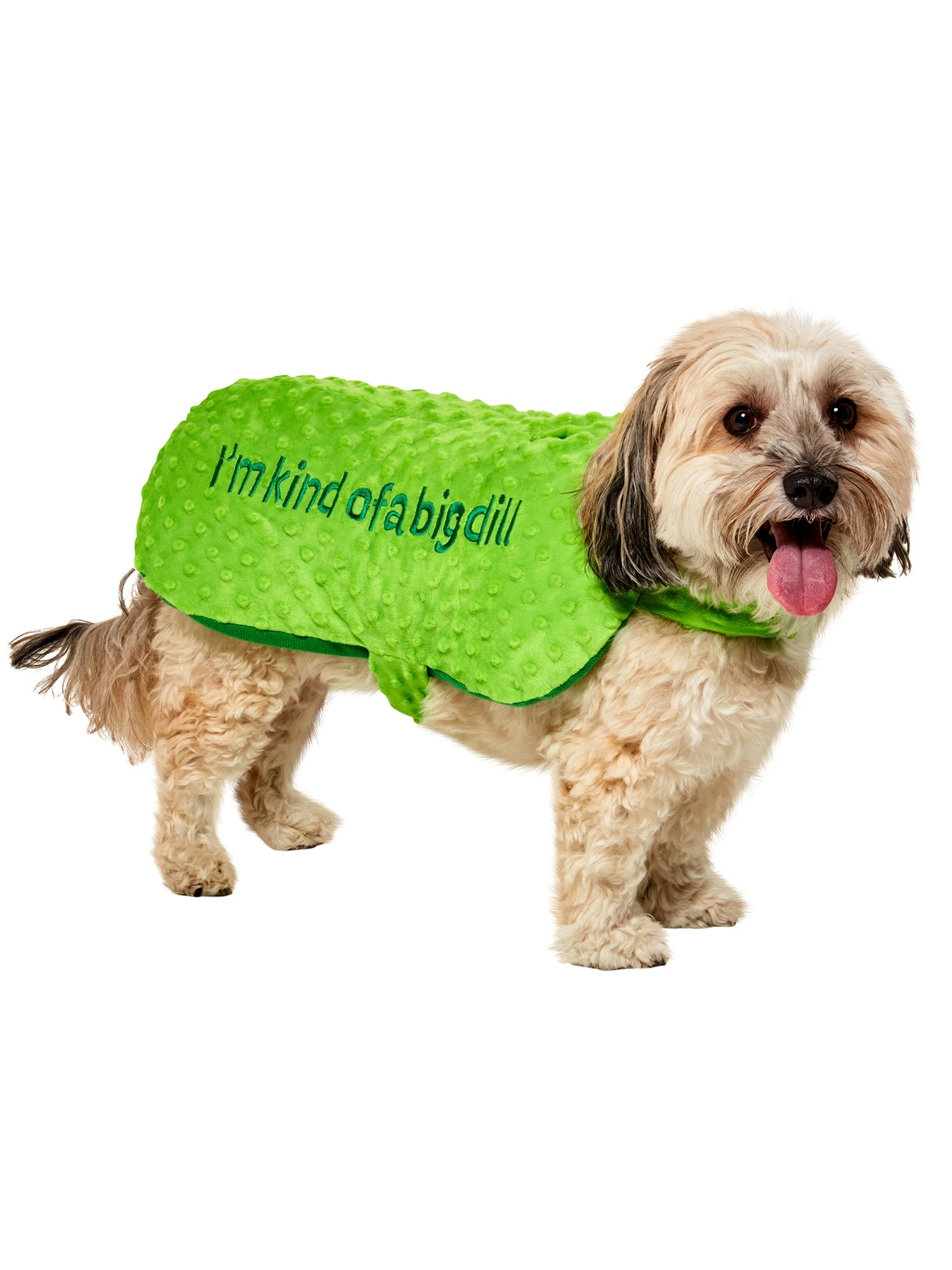 Crafted with meticulous attention to detail, the Yummy World Pickle Pet Costume features a plushy light green pickle design that’s textured and bumpy, capturing the essence of this beloved snack. The phrase “I’m kind of a big dill” is playfully written in a darker green on the side, adding a touch of humor to this charming ensemble.